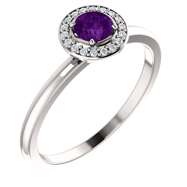 14 Karat White Gold Amethyst & .05 Carat Total Weight Diamond Ring is set with selected fine genuine amethyst and set with the highest craftsmanship standards in 14kt White gold