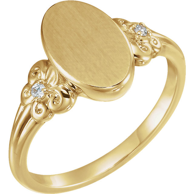 14 Karat Yellow Gold .03 Carat Total Weight Diamond Fleur-de-lis Oval Signet Ring is set with selected fine genuine diamond and set with the highest craftsmanship standards in 14kt Yellow Gold