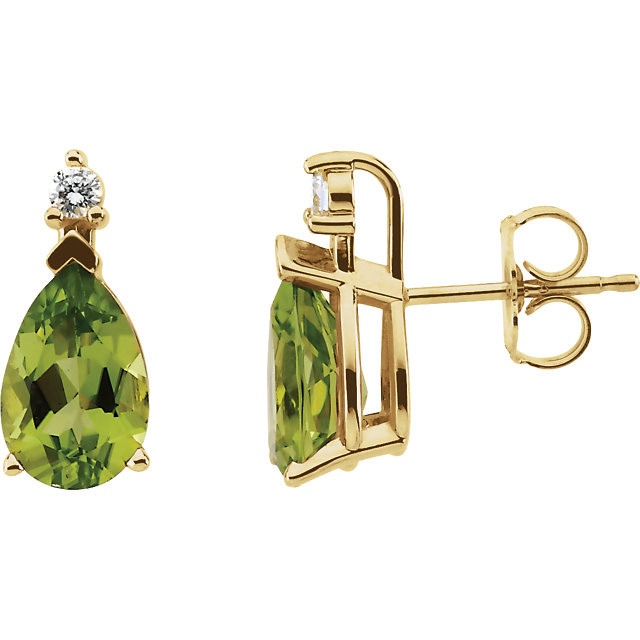 This beautiful 14 Karat Yellow Gold Peridot & .08 Carat Total Weight Diamond Earrings is set with selected fine genuine peridot and set with the highest craftsmanship standards in 14kt Yellow gold