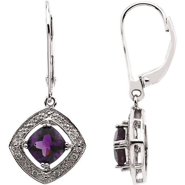 This beautiful 14 Karat White Gold .08 Carat Total Weight Diamond & Amethyst Earrings is set with selected fine genuine amethyst and set with the highest craftsmanship standards in 14kt White gold
