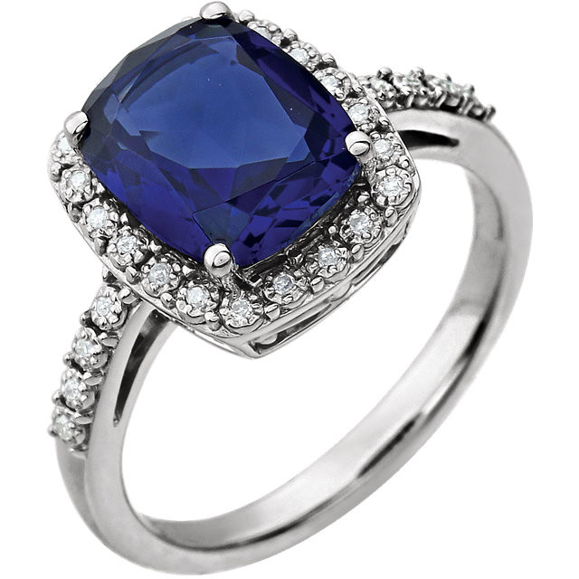 Lab Blue Sapphire set in 14 Karat White Gold Created Cushion  Sapphire and .07 Carat Diamond Ring