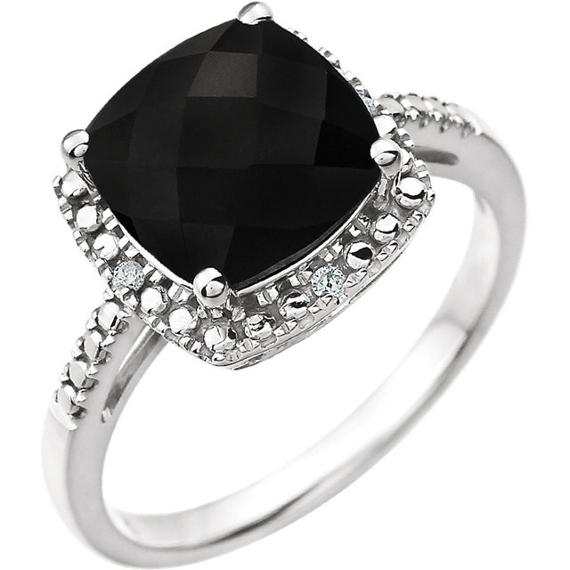 14 Karat White Gold Onyx & .03 Carat Total Weight Diamond Ring is set with selected fine genuine onyx and set with the highest craftsmanship standards in 14kt White gold