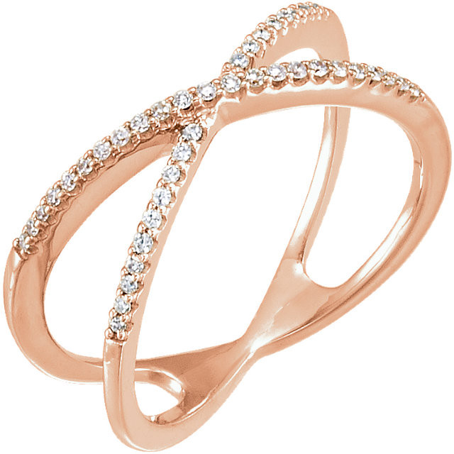 14 Karat Rose Gold 0.17 Carat Total Weight Diamond Criss-Cross Ring is set with selected fine genuine diamond and set with the highest craftsmanship standards in 14kt Rose Gold