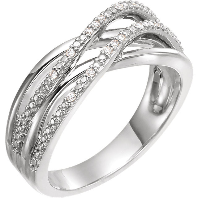 14 Karat White Gold .06 Carat Total Weight Diamond Criss-Cross Ring is set with selected fine genuine diamond and set with the highest craftsmanship standards in 14kt White gold