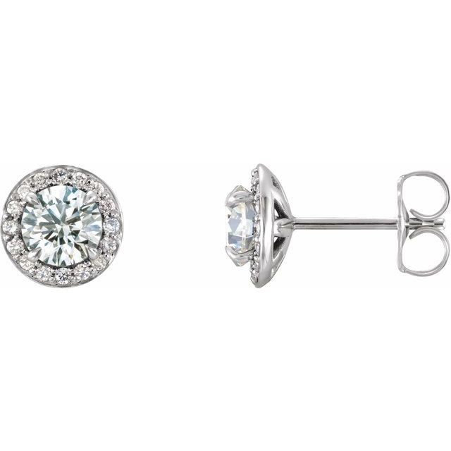 14 Karat White Gold 4 mm Round Forever One Moissanite and 0.13 Carat Diamond Earrings