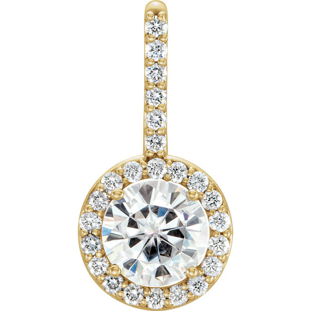 This beautiful 14 Karat Yellow Gold 6.5mm Round Genuine Forever One Moissanite & 0.25 Carat Total Weight Diamond Pendant is set with selected fine moissanite and set with the highest craftsmanship standards in 14kt Yellow gold