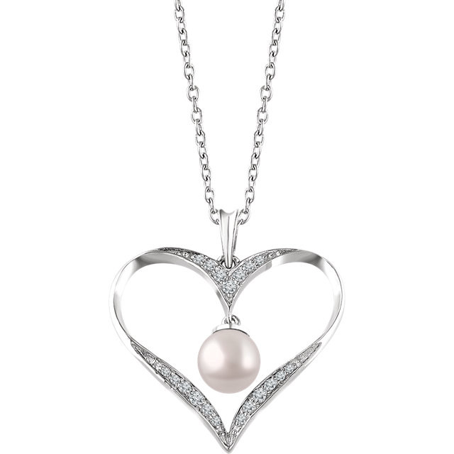 This beautiful Sterling Silver Freshwater Cultured Pearl & 0.17 Carat Total Weight Diamond 16 inch Heart Necklace is set with selected fine genuine pearl and set with the highest craftsmanship standards in sterling silver