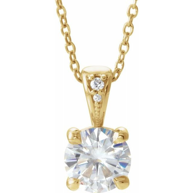 This beautiful 14 Karat Yellow Gold 4 mm Round Forever One Moissanite & .01 Carat Diamond 16 inch Necklace - Chic Round Created Moissanite Necklace is a timeless jewelry item made in the highest standards for Gemstone Fashion jewelry