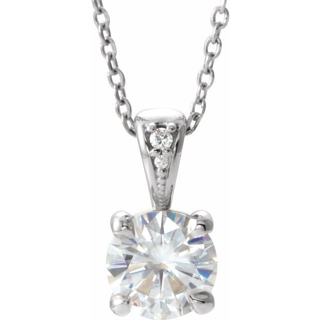 This beautiful 14 Karat White Gold 5 mm Round Forever One Moissanite & .01 Carat Diamond 16 inch Necklace - Pretty Round Created Moissanite Necklace is a timeless jewelry item made in the highest standards for Gemstone Fashion jewelry
