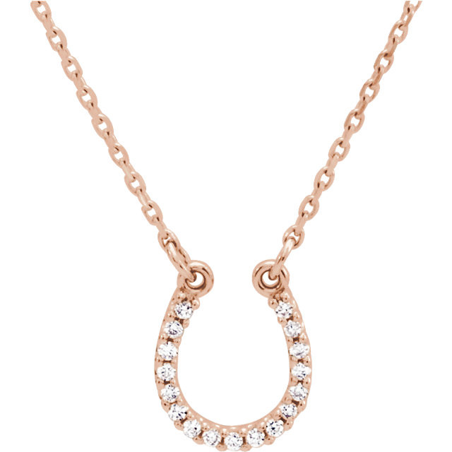 This beautiful 14 Karat Rose Gold .08 Carat Total Weight Diamond Horseshoe 16 inch Necklace is set with selected fine genuine diamond and set with the highest craftsmanship standards in 14kt Rose gold