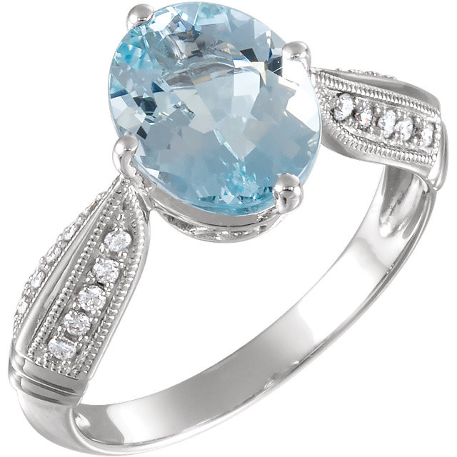 14 Karat White Gold Aquamarine & 0.12 Carat Total Weight Diamond Ring is set with selected fine genuine aquamarine and set with the highest craftsmanship standards in 14kt White gold