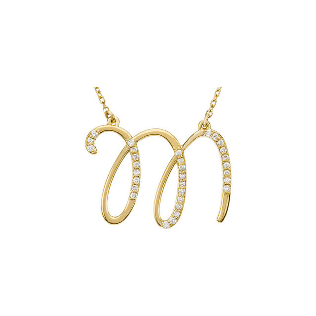 14 Karat Yellow Gold Letter M 00.17 Carat Round Genuine Diamond 17 inch Necklace