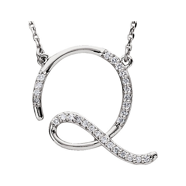 This beautiful 14 Karat White Gold Letter "Q" 0.17 Carat Total Weight Diamond Initial 17" Necklace is set with selected fine genuine diamond and set with the highest craftsmanship standards in 14kt White gold