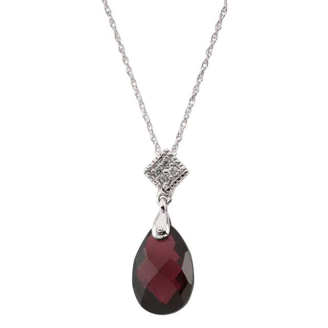 This beautiful 14 Karat White Gold 12x8 Briolette Brazilian Garnet & .04 Carat Total Weight Diamond 18 inch Necklace is set with selected fine genuine garnet and set with the highest craftsmanship standards in 14kt White gold