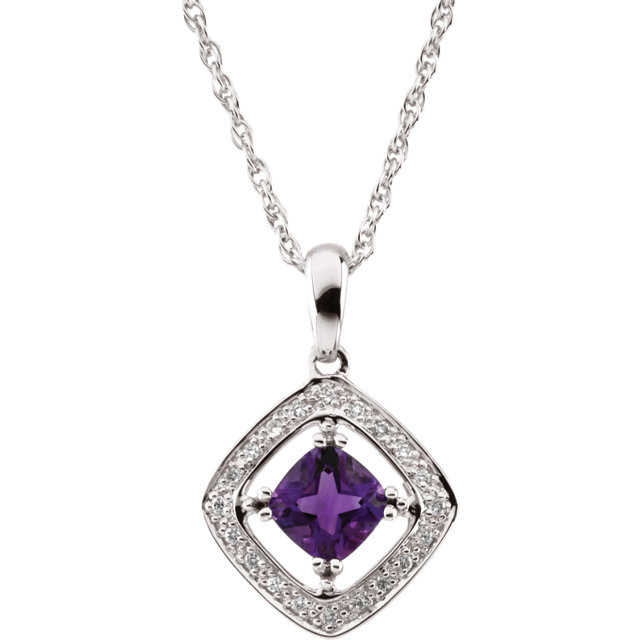 This beautiful 14 Karat White Gold 6x6mm Square Amethyst & 0.10 Carat Total Weight Diamond 18 inch Necklace is set with selected fine genuine amethyst and set with the highest craftsmanship standards in 14kt White gold