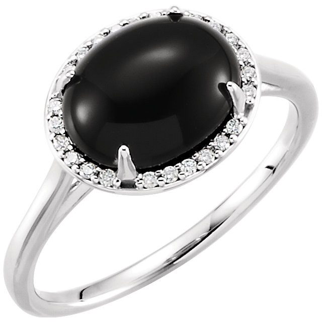 14 Karat White Gold Onyx & .04 Carat Total Weight Diamond Ring is set with selected fine genuine onyx and set with the highest craftsmanship standards in 14kt White gold