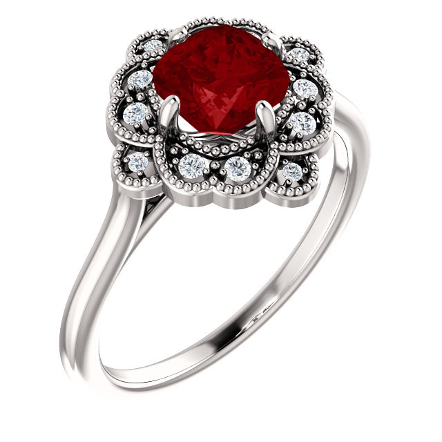 14 Karat White Gold Genuine Lab Grown Created Created Ruby & 0.10 Carat Total Weight Diamond Ring is set with selected fine Lab Grown ruby and set with the highest craftsmanship standards in 14kt White gold