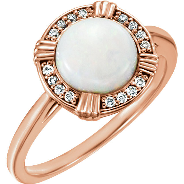 14 Karat Rose Gold Opal & .08 Carat Total Weight Diamond Ring is set with selected fine genuine opal and set with the highest craftsmanship standards in 14kt Rose Gold