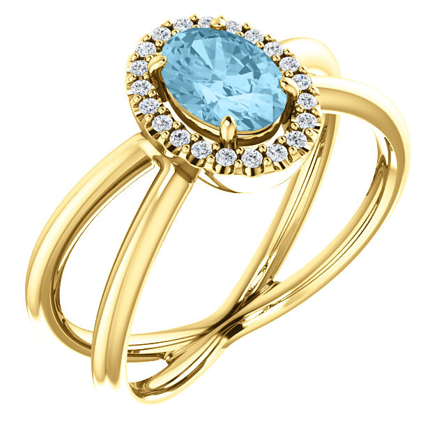 14 Karat Yellow Gold Aquamarine & 0.10 Carat Total Weight Diamond Ring is set with selected fine genuine aquamarine and set with the highest craftsmanship standards in 14kt Yellow Gold