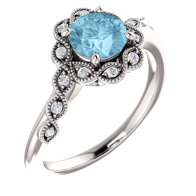 14 Karat White Gold Aquamarine & .07 Carat Diamond Ring - Pretty Round Ring is a timeless jewelry item made in the highest standards for Gemstone Fashion jewelry