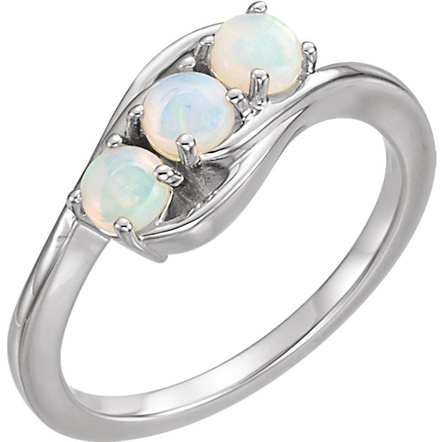14 Karat White Gold Opal Three-Stone Ring is set with selected fine genuine opal and set with the highest craftsmanship standards in 14kt White gold