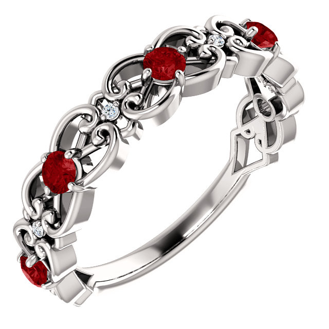 14 Karat White Gold Ruby & .025 Carat Total Weight Diamond Vintage-Inspired Scroll Ring is set with selected fine genuine ruby and set with the highest craftsmanship standards in 14kt White gold