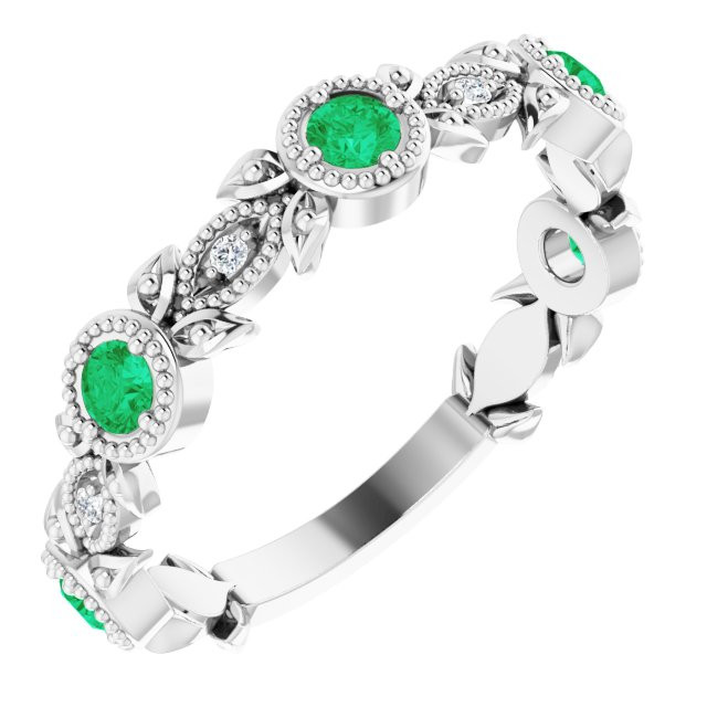 14 Karat White Gold Emerald & .03 Carat Diamond Leaf Ring - Beautiful Round Emerald Ring is a timeless jewelry item made in the highest standards for Gemstone Fashion jewelry