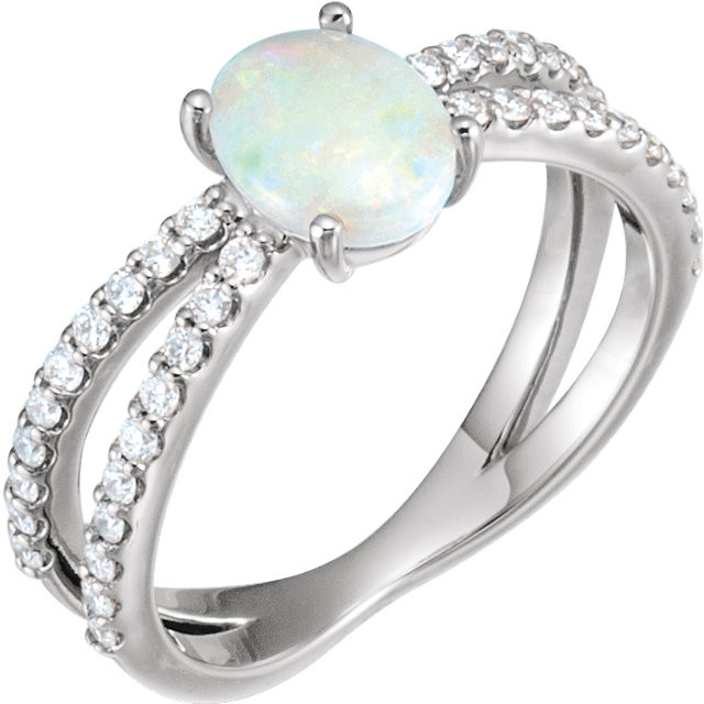 Platinum Opal & 0.33 Carat Total Weight Diamond Ring is set with selected fine genuine opal and set with the highest craftsmanship standards in platinum