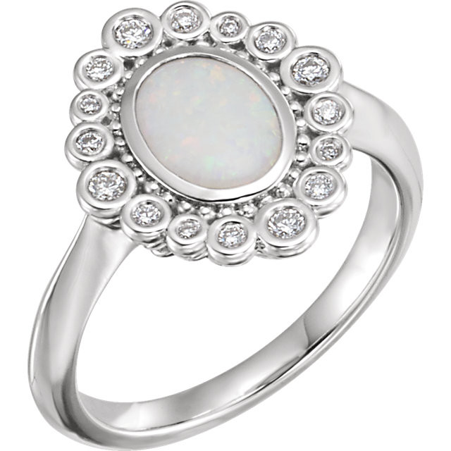 Sterling Silver Opal & 0.17 Carat Total Weight Diamond Ring is set with selected fine genuine opal and set with the highest craftsmanship standards in sterling silver