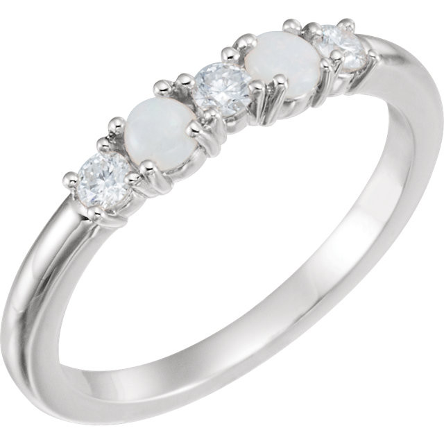 14 Karat White Gold Opal & 0.20 Carat Total Weight Diamond Stackable Ring is set with selected fine genuine opal and set with the highest craftsmanship standards in 14kt White gold