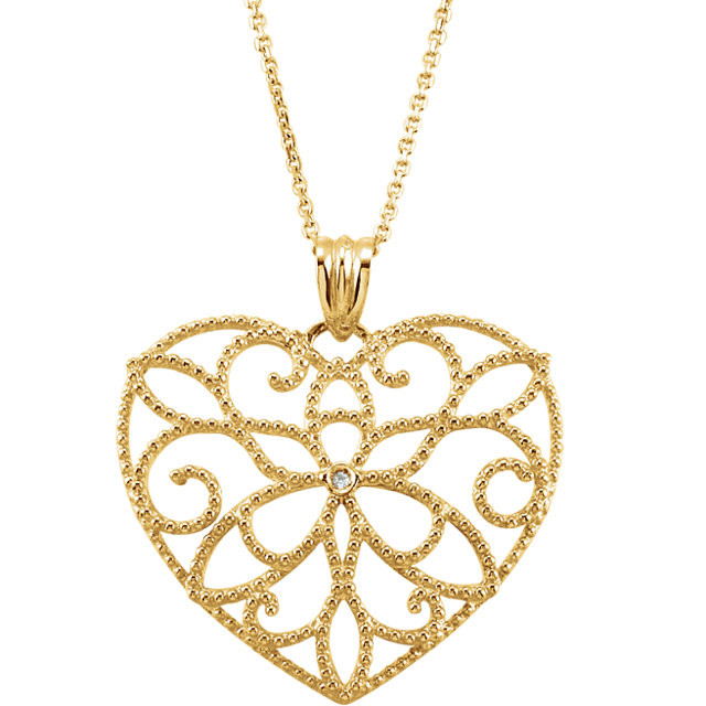 This beautiful 14 Karat Yellow Gold .005 Carat Total Weight Diamond Heart 18 inch Necklace is set with selected fine genuine diamond and set with the highest craftsmanship standards in 14kt Yellow gold