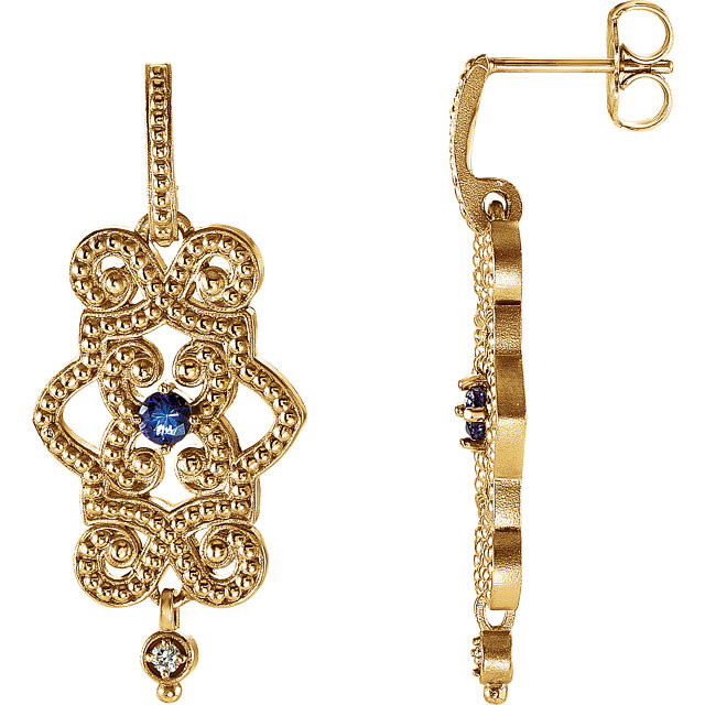 14 Karat Yellow Gold Tanzanite and .03 Carat Diamond Granulated Design Dangle Earrings