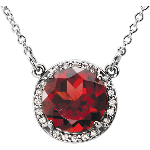 This beautiful Sterling Silver 6mm Round Genuine Red Garnet & .04 Carat Total Weight Diamond 16 inch Necklace is set with selected fine genuine garnet and set with the highest craftsmanship standards in sterling silver