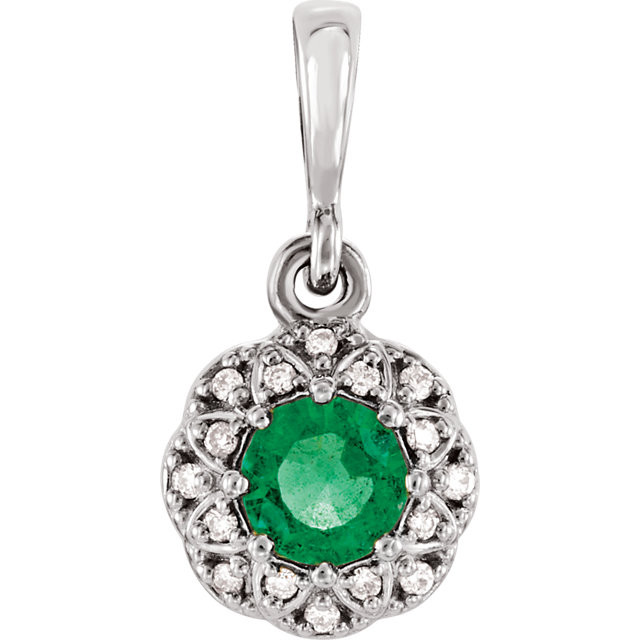 This beautiful 14 Karat White Gold Emerald & .04 Carat Total Weight Diamond Halo-Style Pendant is set with selected fine genuine emerald and set with the highest craftsmanship standards in 14kt White gold