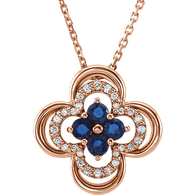 This beautiful 14 Karat Rose Gold Blue Sapphire & 0.10 Carat Total Weight Diamond 18 inch Necklace is set with selected fine genuine blue sapphire and set with the highest craftsmanship standards in 14kt Rose gold