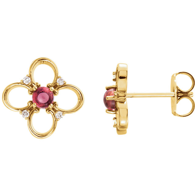 This beautiful 14 Karat Yellow Gold Pink Tourmaline & .04 Carat Total Weight Diamond Earrings is set with selected fine genuine pink tourmaline and set with the highest craftsmanship standards in 14kt Yellow gold