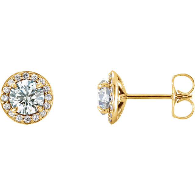 This beautiful 14 Karat Yellow Gold Round White Sapphire & 0.12 Carat Total Weight Diamond Earrings is set with selected fine genuine sapphire and set with the highest craftsmanship standards in 14kt Yellow gold