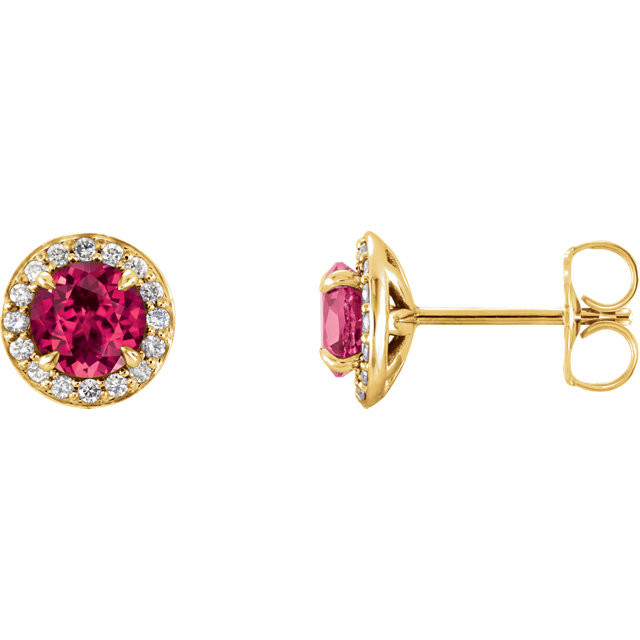 This beautiful 14 Karat Yellow Gold 4 mm Round Created Ruby & 0.12 Carat Total Weight Diamond Earrings is set with selected fine ruby and set with the highest craftsmanship standards in 14kt Yellow gold