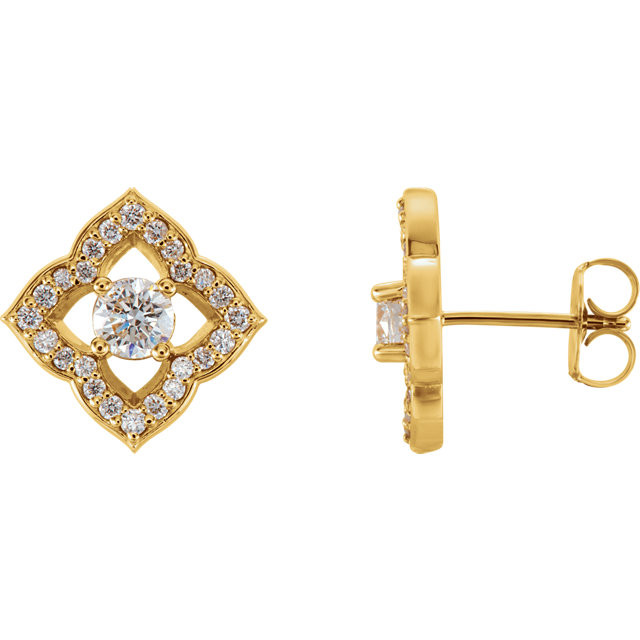 This beautiful 14 Karat Yellow Gold 0.75 Carat Total Weight Diamond Halo-Style Clover Earrings is set with selected fine genuine diamond and set with the highest craftsmanship standards in 14kt Yellow gold