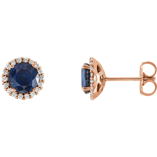 This beautiful 14 Karat Rose Gold Blue Sapphire & 0.17 Carat Total Weight Diamond Earrings is set with selected fine genuine sapphire and set with the highest craftsmanship standards in 14kt Rose gold