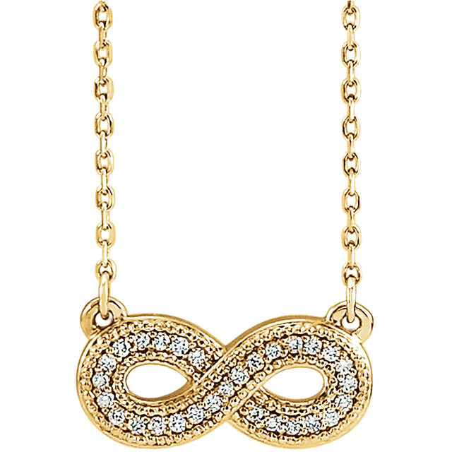 This beautiful 14 Karat Yellow Gold .08 Carat Total Weight Diamond Infinity-Inspired 16 inch Necklace is set with selected fine genuine diamond and set with the highest craftsmanship standards in 14kt Yellow gold