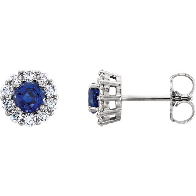 This beautiful Platinum Genuine Created Created Blue Sapphire & 0.40 Carat Total Weight Diamond Halo-Style Earrings is set with selected fine blue sapphire and set with the highest craftsmanship standards in sterling silver