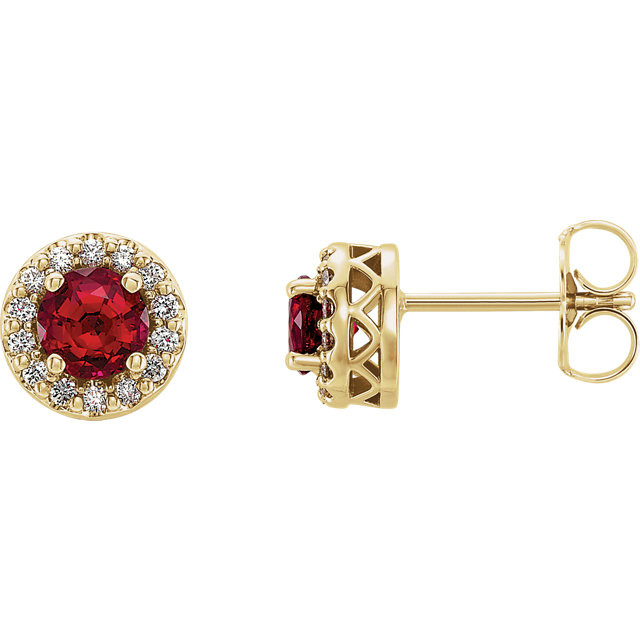 This beautiful 14 Karat Yellow Gold Genuine Created Created Ruby & .08 Carat Total Weight Diamond Earrings is set with selected fine ruby and set with the highest craftsmanship standards in 14kt Yellow gold