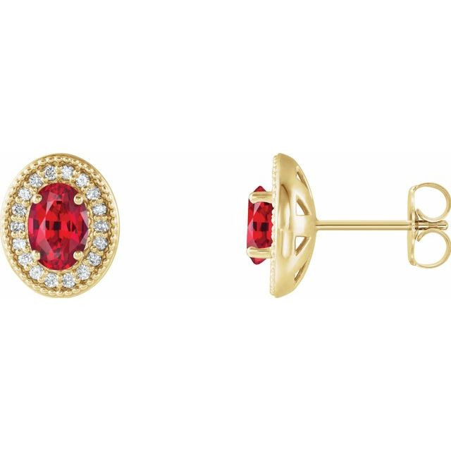 This beautiful 14 Karat Yellow Gold Created Ruby & 0.20 Carat Diamond Halo-Style Earrings, these Charming Oval Lab-Created Ruby Earrings is a timeless jewelry item made in the highest standards for Gemstone Fashion jewelry