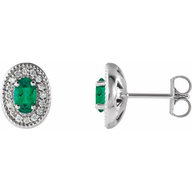 This beautiful 14 Karat White Gold Created Emerald & 0.12 Carat Diamond Halo-Style Earrings - Elegant Oval Lab-Created Emerald Earrings is a timeless jewelry item made in the highest standards for Gemstone Fashion jewelry