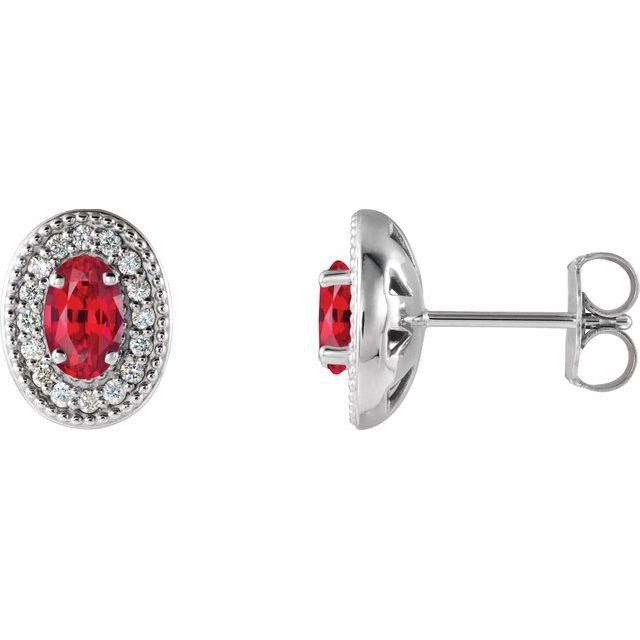 This beautiful 14 Karat White Gold Ruby & 0.12 Carat Diamond Halo-Style Earrings , these Attractive Oval Ruby Earrings is a timeless jewelry item made in the highest standards for Gemstone Fashion jewelry