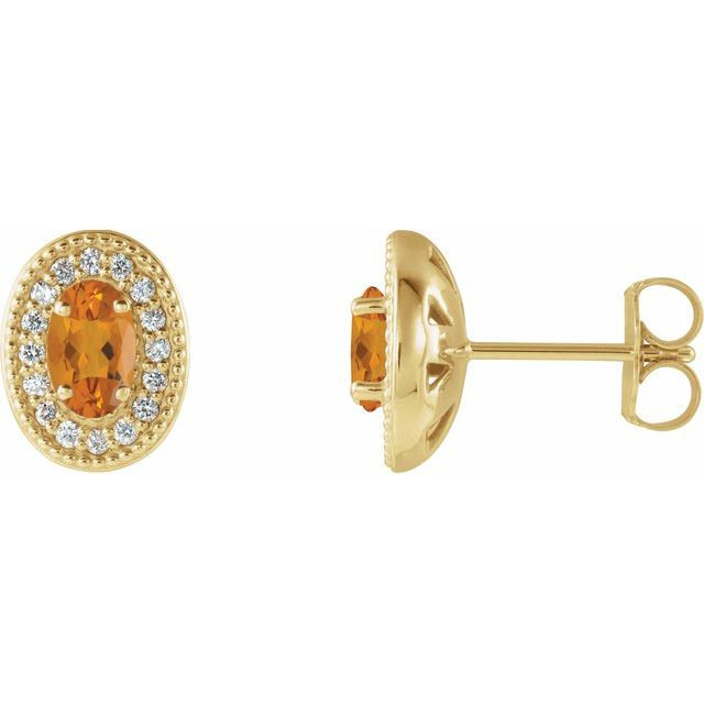 This beautiful 14 Karat Yellow Gold Citrine & 0.12 Carat Diamond Halo-Style Earrings , these Gorgeous Oval Citrine Earrings is a timeless jewelry item made in the highest standards for Gemstone Fashion jewelry