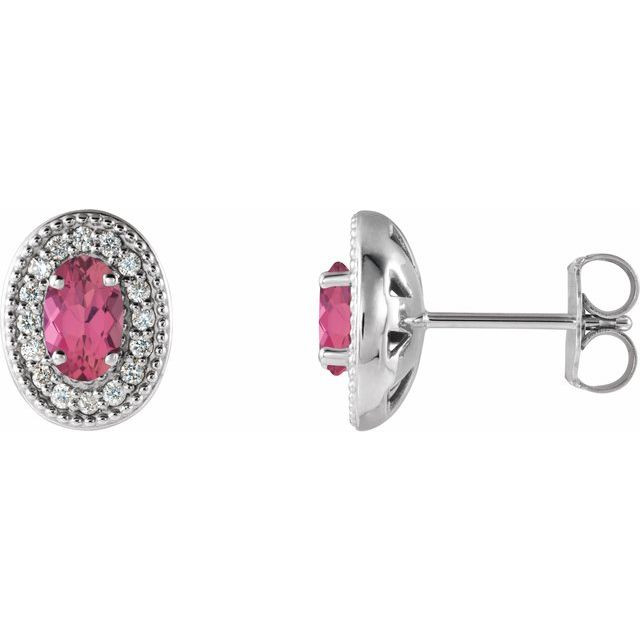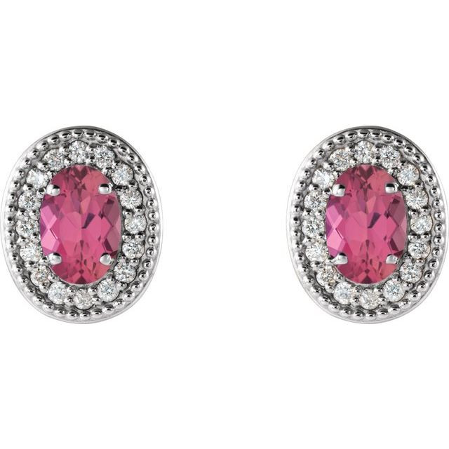 Sterling Silver 7x5 mm Natural Pink Tourmaline and 0.20 Carat Natural Diamond Halo Earrings Comes Set With