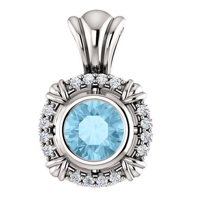 This beautiful Platinum Aquamarine & .08 Carat Total Weight Diamond Pendant is set with selected fine genuine aquamarine and set with the highest craftsmanship standards in sterling silver