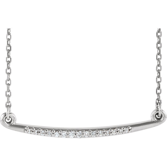 This beautiful 14 Karat White Gold .05 Carat Total Weight Diamond Curved Bar 16 inch Necklace is set with selected fine genuine diamond and set with the highest craftsmanship standards in 14kt White gold